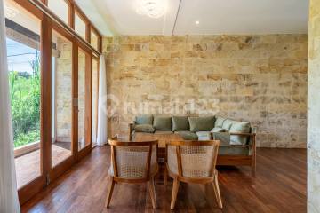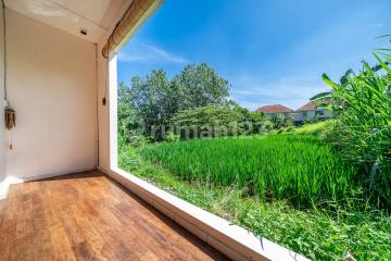 FOR RENT CHARMING 2 BEDROOM VILLA WITH RICE FIELD VIEW Rental price IDR 110 million per year Property details Total land area 130 square meters Living area 80 square meters Rice field view with open and unobstructed scenery Front garden area Parking space for one car and several motorbikes Interior features Two air conditioned bedrooms with teak beds and storage One bathroom with marble sink and separate toilet Modern kitchen equipped with new refrigerator Bright living room with teak dining table and chairs, velvet sofa size 240 by 160 centimeters with storage Merbau wood flooring throughout the house Natural Paras Jogja stone wall finishes Storage room available Comfort and security Air conditioning in bedrooms and living room Video surveillance system with two cameras, human detection, and voice interaction controlled via mobile application Thirty liter water heater with constant pressure system New sliding gate securing the entire property Additional advantages Excellent natural lighting from large bay windows and terrace doors Comfortable indoor temperature throughout the year due to natural stone materials Quiet residential environment ensuring privacy and tranquility One hundred percent flood free area Nearby facilities Alfamart 500 meters Pharmacy 100 meters Fuel station 100 meters Laundry 300 meters Pepito supermarket 7 minutes Traditional market 7 minutes Local supermarket 10 minutes Gym 3 minutes