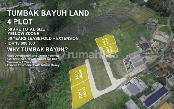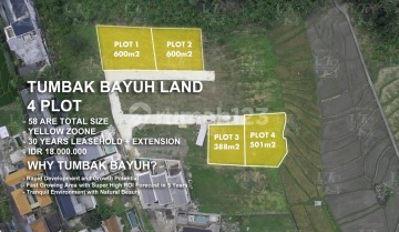 Description Discover a fantastic investment opportunity with these four plots of land in Tumbak Bayuh, available for a 30-year leasehold with an extension option. Offering a total of 58 Are, this land is located in a Yellow Zone, making it suitable for a variety of development projects. The serene environment of Tumbak Bayuh, combined with rapid growth in the area, positions this land as an excellent choice for investors seeking long-term returns. Location: Tumbak Bayuh, Bali Situated in a peaceful and natural setting, Tumbak Bayuh is gaining attention from investors and developers looking to capitalize on the region's growth potential. Property Features: Plot 1: 600 m² Plot 2: 600 m² Plot 3: 388 m² Plot 4: 501 m² Total Land Size: 58 Are Leasehold: 30 years + extension Yellow Zone: Suitable for development Price in IDR: 20,000,000/Are/Year Price in USD: 1,281/Are/Year Investment Benefit: Unmatched Potential in a Thriving Development Area These plots in Tumbak Bayuh offer investors a chance to secure land in one of Bali’s fastest-growing areas. With the region's increasing popularity, this investment promises high returns within the next few years. High ROI forecast within 5 years Located in a peaceful and rapidly growing region Ideal for development projects with strong demand