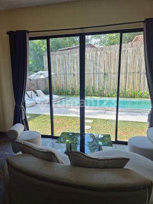 Land 4 Are | Building 360 m² | 2 Floors Bedrooms & Bathrooms - Master bedroom - large, 2x AC, walk-in closet, bathtub bathroom - Second bedroom - AC, walk-in closet, ensuite - Third bedroom - AC, walk-in closet, open ensuite & bathtub - Guest bedroom - AC, wardrobe, ensuite Living & Lifestyle - Family lounge with AC, 9ft pool table & sofa - Enclosed living room with AC - Modern marble kitchen with island dining (8 seats) - Private pool 8m x 3m + sunbed area - Spacious garden - Parking: 2 cars + 6 bikes - Glass balcony facing river & rice field Facilities - High-speed Wi-Fi up to 400 Mbps - CCTV - Cleaning service (on request) - Garbage collection - Pool maintenance Price - Yearly rent: IDR 525,000,000