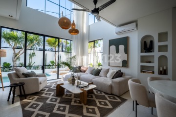 Located in the residential enclave of Umalas near Canggu, this contemporary two-level villa is offered under LEASEHOLD until 1st February 2053 + 25 years guaranteed extension. Positioned close to leading restaurants, shops, international schools, and minutes from beaches, the property blends lifestyle convenience with a projected net ROI of 12%+. The villa provides three bedrooms with balconies, three bathrooms plus a guest bathroom, and an airy indoor-outdoor living area defined by a dramatic six-metre double-height ceiling and polished terrazzo flooring throughout. A dining area, walk-in wardrobe, terrazzo bathtub, and well-equipped kitchen fitted with electric oven and cooktop enhance daily living. Outdoors, a north-facing swimming pool with bench seating, established easy-care gardens, and private carport complete the setting. Additional functionality includes semi-furnished delivery with fitted kitchen, bathrooms, wardrobes and air-conditioning, plus optional full furniture packages for turnkey use. A staff area with laundry room, SLF certification with Pondok Wisata, three-phase 16,500-watt electricity supply, and Australian-standard construction backed by a structural warranty ensure both comfort and reliability within easy reach of Seminyak and surrounding coastal hubs.