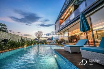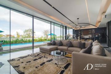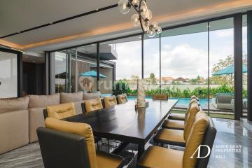 Located in the highly desirable Bumbak area of Umalas, this stunning luxury villa offers quick and easy access to vibrant Canggu and Seminyak, international schools, top dining venues, boutique shopping, and Bali's most beautiful beaches, all just 45 minutes from Ngurah Rai International Airport. Set on 500 square metres of land with a total built-up area of 1,060 square metres over three levels, this exceptional property is available for purchase under either a freehold or a long leasehold title (up to 60 years). Designed for modern living with a focus on comfort and sophistication, the villa captures the ambience of a five-star hotel, featuring high-end finishes, elegant interiors, and premium materials throughout. The villa features five expansive bedroom suites, each equipped with luxurious en-suite bathrooms complete with bathtubs, private workspaces, and generous wardrobe areas. The spacious open-plan living and dining area is complemented by a fully equipped modern kitchen, a guest powder room, a private office, and a gym. Outdoor highlights include a 14-metre swimming pool with a jacuzzi, perfect for entertaining and relaxation. Additional features include a Bose sound system, smart lock security, CCTV, solar panels, a water filtration system, staff quarters, a laundry room, ample storage, and a secure basement garage with additional parking. Built in 2023. Price: IDR 27,000,000,000.