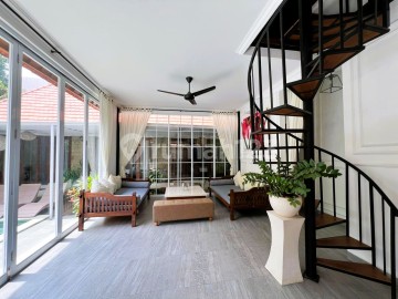 Positioned in the sought-after Bumbak enclave of Umalas, this FREEHOLD villa delivers generous space and everyday comfort in one of Bali's most livable residential zones. Quiet and private, yet minutes from Canggu, Berawa, and Seminyak, the location strikes a rare balance between calm home living and easy access to cafés, international schools, and lifestyle hubs. Designed for relaxed living and entertaining, the home centers around a wide open-plan living and dining area that opens directly to the pool and outdoor dining space. A modern kitchen with gas stove, hood, and electric oven supports both daily routines and hosting, while the outdoor billiard area adds a social edge. Four ensuite bedrooms ensure privacy for family or guests, complemented by a cozy reading mezzanine, ample storage, linen rooms, and a fully equipped staff room with its own bathroom and kitchen. A 12 x 3 meter private swimming pool, secure two-car garage, and full furnishings make the villa completely move-in ready. Supported by 7,700 VA electricity, well water with pump, high-speed WiFi, and CCTV security, this property stands out as a solid long-term residence or a legally ready rental investment in one of Bali's most dependable neighborhoods.