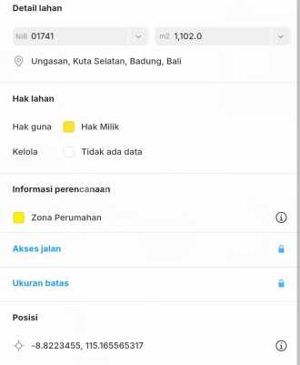 DI JUAL TANAH YANG BERLOKASI DI GOA GONG UNGASAN BALI VIEW GWK Lokasi Ungasan Goa gong Luas tanah 1.200 m² / 12 Are Lebar depan 23 meter ITR PEMUKIMAN SHM Kultur tanah tinggi dan datar Akses jalan 5 meter Aspal Hadap timur Cocok Untuk Tempat tinggal dan Villa Harga IDR 500 Juta/m² Atau Rp 5Juta/are