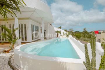 White Villa in GWK Bali For Sale Mediteranean Style Located in Jimbaran Bali # Details : - Land area 225m2 + 388m2 = 613m2 (2 SHM ) - Building area ±500m2 - 3 Bedrooms. - 3 Bathrooms - 1 Multifunction room - Living & Dining area - Kitchen set - Swimming pool - Jacuzzi on roof top - View Ocean, Airport & GWK Statue - Price Freehold IDR 15.000.000.xxx