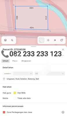 Properti unk Pembeli Langsung Di Jual Tanah Sangat Strategis di Jl Dharmawangsa Ungasan . Lokasi berada di kawasan berkembang , dan sangat cocok unk segala jenis Usaha. cafe, kantor ,gudang, co working space dll Berada diakses Jalan Utama , lokasi Hook. - 5 menit ke Pantai Pandawa dan Gunung Payung Luas Tanah 1800 M2 ( 18 are ) Dimensi 50 x 30 meter Orientasi Hadap Selatan Legalitas SHM Ijin Tata Ruang Zona Perdagangan Dan Jasa Harga HANYA 650 juta / are Informasi lebih lanjut Hubungi sy Fast Respons silahkan Call Atau WhatsApp
