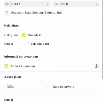 BERADA TEPAT DISEBELAH TIMUR PATUNG GWK Lokasi dengan lingkungan yang tenang dan nyaman berada pada area villa - villa mewah di Ungasan Jln. Merak * Luas tanah 3,5 are / 350 m² * Lebar depan 23 meter * Hadap timur * Kontur tanah datar siap bangun * ITR Permukiman (Kuning) * Akses jalan hotmix 6 meter * SHM * Jaringan Wifi / PDAM / PLN Tersedia siap sambung * SHM * Sangat bagus jika dibangun Villa / Guest house / dll. Harga : Rp 575Jt / are / 100 m²