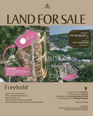 Freehold Land Size: 20 are (2,000 m2). Zoning: Pink (commercial/mixed use). Views: Ocean views. Utilities: PLN power and PDAM water available. Access: Direct access on a main public road (no private right-of-way). in the heart of Uluwatu - 5 Minutes from Savaya - 5 Minutes from Sunday Beach Club - 10 Minutes from Padang Padang more info anggun gpd