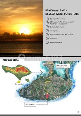 DIJUAL TANAH PREMIUM Lokasi : Jln. Pura Batu Pageh Pandawa Nusa Dua Luas Tanah : 1.15 Hektar View : Pantai pandawa Cocok buat Resort , Villa, resto Lingkungan Villa elit dan resort Berdekatan dg Nazeki Villa Kontur tanah sudah ditata dan batas2 nya sudah di fondasi keliling. Sunset kelihatan dari lokasi Akses jalan 6 mtr ITR : kuning 10 menit ke pantai Pandawa 15 menit ke pantai Melasti 20 menit ke GWK 15 menit ke ITD Nusa Dua 2 SHM Harga 650 juta/ are nego cais