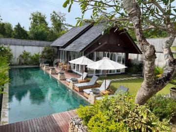 Villa Bali SHM on hand IMB ada LT 813 m² LB 500 m² KT villa 4KT + rumah 3 KT total 7KT KM 10 Swimming pool 15 meter x 4 meter depth from 1 meter gradually to 1.75 meter Listrik 7700 watts x 4 Air pam Harga 15M nego