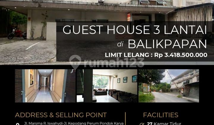 Kost di Gunung Bahagia, Balikpapan. Dijual di wilayah yang asri. Dengan rinciannya adalah sebagai berikut: - Kamar Tidur: 27 - Kamar Mandi: 27 - Sertifikat: SHM - Sertifikat Hak Milik Dan properti ini juga unggul karena: - Dekat Pusat Perbelanjaan. - Dekat Akses Bandara. - Dekat Fasilitas Kesehatan. - Aset Lelang. Lokasi kost berikut strategis, hanya selangkah menuju berbagai fasilitas utama dan menarik. Hanya Rp. 3.410.000.xxx, anda bisa langsung dapatkan kost istimewa di daerah Gunung Bahagia ini.
