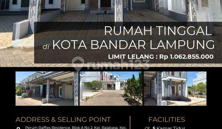 Rumah 2 lantai di Rajabasa, Bandar Lampung. Dijual rumah di wilayah yang asri. Properti 2 lantai ini berada di lingkungan yang mudah dijangkau. Spesifikasinya adalah sebagai berikut: - Kamar Tidur: 5 - Kamar Mandi: 3 - Sertifikat: SHM - Sertifikat Hak Milik - Hadap: Utara - Kondisi Perabotan: Unfurnished Tentunya properti ini layak untuk dimiliki karena: - Dekat Tempat Ibadah. - Dekat Pusat Perbelanjaan. - Dekat Fasilitas Kesehatan. - Aset Lelang. Properti ini sudah lengkap dengan fasilitas: - Akses Parkir. Keberadaan rumah berikut mudah dijangkau, hanya selangkah menuju berbagai fasilitas utama dan menarik. Hanya Rp. 1.060.000.xxx, anda bisa langsung dapatkan rumah istimewa di daerah Rajabasa ini.