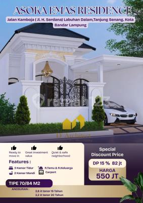 " ASOKA EMAS RESIDENCE " Hunian Exclusive, Mewah, Megah & Menarik di Kota Bandar Lampung. "ONE GATE SYSTEM" Lokasi Perumahan: Jalan Kamboja ( Jl. H. Serdana) Labuhan Dalam,Tanjung Senang. Kota Bandar Lampung TYPE 70/84 M² (6x14) * Kamar Tidur 3 * Kamar Mandi 2 * Free Pagar Dan Gerbang Besi (Pembelian Cash ) SKEMA PEMBAYARAN : * Promo Harga Cash Keras/Lunas : 550 jt (Bebas Semua Biaya) * KPR DP : 15% = 82jt, * Estimasi Angsuran 3,8jt an * Cash Tempo By Progres 50%, 30%, 20% Booking Fee 10 jt (Sudah termasuk DP) Note: Pembelian cash all in Bebas semua Biaya² , Kecuali Proses kpr bank ada Asuransi Jiwa, Kebakaran & Hold Angsuran, HT konsumen, SPESIFIKASI: * Pondasi: Batu Belah * Dinding: Bata Plaster Aci Cat, * Molding, Lampu Gantung * Slof: Beton Bertulang * Lantai: Granit 60 x 60 * Plafond Gypsum/PVC + Dekor * Listrik: 1300 Watt * Air: Sumur Bor+Mesin+Tower Masing²rumah * Genteng: tanah dicat * Rangka atap : Baja ringan * Pintu & Kusen: kayu Cempaka class 1 di cat Plitur * Dapur + Wastafel * Sanitasi: Closed duduk & Shower * Carport: Batu Sikat * Tanah Taman * Darcor garasi Keunggulan Lokasi 500 meter dari jln bypass Sukarno Hatta , Dekat dg: v Jalan Utama Ir. Soekarno Hatta (Baypass) vKampus Unila, Polinela, Universitas Terbuka vPusat Pendidikan Sma/Smk yadika, sma n 13 balam, sma n 5 balam, smp 29 balam, vPolsek Kedaton vPusat Perbelanjaan Indo Grosir , Chamart, Indomaret, Alfamaret