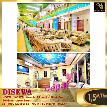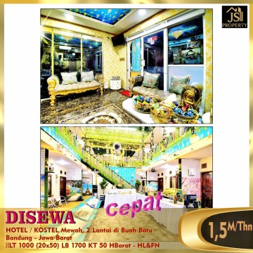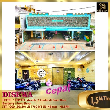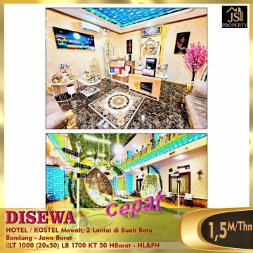 DISEWAKAN HOTEL / KOSTEL Mewah, 2 Lantai di Buah Batu Bandung - Jawa Barat Letak nya di pinggir jalan raya, Kondisi Hotel Masih Baru, lokasi strategis dekat pintu tol buah batu , bersebelahan dgn Indomaret, Alfamart & ATM BCA, dekat Universitas Telkom, dekat Metro Indah Mall, dekat Transmart. Luas Tanah 1.000 m² Ukuran dimensi 20 x 50 m² Luas Bangunan 1.700 m² Jumlah kamar + kamar mandi dlm : 50 kamar Listrik 1.300 Watt (per-kamar) Air Sumur Hadap Barat Fasilitas Hotel : semua kamar ada AC , water heater ,kamar mandi dalam & TV cable , free wifi, Akses Card, Ruang Makan, Lounge ,Taman & Mushollah. Harga Sewa 1,5M / Thn Nego - HL&FN