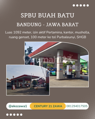 DIJUAL SPBU DI BANDUNG Lokasi : Bandung Kidul - Bandung Jawa Barat Jl Terusan Buah Batu Spec : * SPBU MASIH AKTIF * Luas Tanah 1092 m² * Luas Bangunan 385 m² * Lebar Muka +/- 45 meter - Status SHGB * 1 Kantor * 2 Kamar Mandi * 1 Musholla * 1 ruang Genset * 2 Shelter * Mesin Pompa 4 * Tangki pemdam 3 * 100 meter ke Toll Purbaleunyi Buah Batu * Dekat Dengan RS Mayapada HARGA JUAL 30 MILIAR - Exc PPN NEGOTIABLE Terima Titip dan Jual Beli Property Seluruh Indonesia KHUSUS PEMBELI SERIUS silakan hubungi: Eko Pakpahan 0812xxxxxxxx Century21 Zawa PIK #tanahdijual #tanahforsale #gudangdijual #gudangforsale #pabrikdijual #pabrikforsale #gudangpabrikforsale #mm2100 #kawasanindustri #kawasanindustrimm2100
