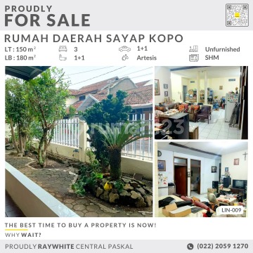 FOR SALE Rumah sayap kopo Daerah sukamenak * LT 150 m2 * LB 180 m2 * KT 3 * KM 1+1 * dapur bersih * taman depan * listrik 1300 W * air artesis * garasi 1 * car port 1 * hadap barat * SHM Harga 1,2 M nego More info Linda ******** Ray white central paskal