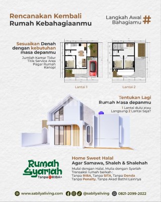 Wujudkan rumah impian yang nyaman dan bebas riba. 2 lantai | 3 kamar | 2 kamar mandi Lokasi strategis di Ujungberung - akses mudah ke Antapani Tanpa riba, tanpa sita, tanpa denda , 100% syariah.