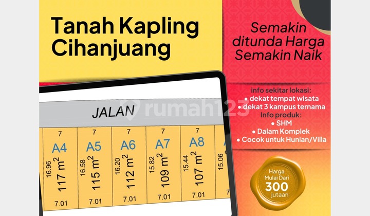 Miliki segera kavling terbaik di kawasan Cihanjuang, Bandung Barat, lingkungan yang terkenal dengan udara sejuk, suasana tenang, dan pemandangan yang masih asri. Lokasi ini sangat cocok untuk Anda yang ingin membangun rumah impian dengan suasana nyaman jauh dari hiruk pikuk kota, namun tetap dekat dengan berbagai fasilitas penting. Kavling ini berada di area dalam komplek yang tertata, memberikan kenyamanan dan privasi bagi para penghuninya. Akses menuju lokasi juga sangat mudah karena sudah dapat dilalui mobil, sehingga memudahkan aktivitas sehari-hari maupun pembangunan rumah di masa depan. Salah satu keunggulan utama dari lokasi ini adalah jaraknya yang sangat strategis, hanya sekitar 8 menit menuju Dusun Bambu, salah satu destinasi wisata terkenal di Bandung Barat. Hal ini membuat lokasi kavling tidak hanya ideal untuk tempat tinggal, tetapi juga memiliki nilai investasi yang sangat baik, baik untuk rumah pribadi, villa, maupun properti sewa. Kavling ini sudah memiliki legalitas SHM (Sertifikat Hak Milik) sehingga memberikan rasa aman dan kepastian hukum bagi Anda sebagai pemilik. Proses transaksi juga lebih mudah karena dokumen legalitas sudah jelas dan siap untuk proses balik nama. Dengan lingkungan yang hijau, udara yang segar, serta lokasi yang terus berkembang, tanah kavling di area Cihanjuang ini sangat potensial untuk kenaikan nilai properti di masa depan. Sangat cocok bagi Anda yang sedang mencari tanah siap bangun di kawasan berkembang Bandung Barat. Harga mulai dari 300 jutaan Keunggulan Lokasi: Dekat wisata Dusun Bambu (±8 menit) Lingkungan sejuk dan asri Akses mobil sampai lokasi Berada dalam area komplek Legalitas SHM (Sertifikat Hak Milik) Cocok untuk rumah tinggal, villa, atau investasi Kesempatan terbatas untuk memiliki tanah kavling strategis di kawasan yang berkembang pesat ini. Jangan lewatkan peluang memiliki properti dengan lokasi premium dan potensi investasi yang menjanjikan. Lokasi: Cihanjuang, Bandung Barat Segera hubungi kami untuk informasi lebih lanjut dan jadwalkan survey lokasi agar Anda bisa melihat langsung potensi kavling ini.