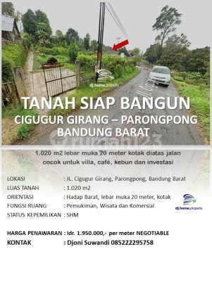 Tanah di jl cigugur girang parongpong bentuk tanah kotak dengan lebar muka 23 meter, elevasi tanah diatas jalan cocok untuk dibangun cafe resto, villa kebun, view ke bukit Spesifikasi Utama Properti: - Sertifikat hak milik Fitur unggulan: - Siap Huni. - Bebas Banjir. - Dekat Tempat Wisata. - Dekat Tempat Ibadah. - Dekat Sekolah Negeri. - Dipinggiran kota. - Sejuk. - Cocok Untuk Investasi. - Properti Bisa Nego. - Akses Jalan Muat 2 Mobil. - Hitungan Tanah Kavling. - Hitungan Tanah Meter Persegi. lokasi strategis dekat resto rumah stroberry the peak desa wisata cihideung tempat wiata lembang tanah ini memberikan kemudahan akses ke berbagai fasilitas menarik. Dengan harga Rp. 2.000.000, per meter yang sudah siap dibanguna. Jangan lewatkan kesempatan untuk menikmati pengalaman memiliki tanah di kawasan Parongpong yang nyaman ini! Hubungi segera untuk informasi lebih lanjut!