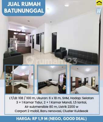 DIJUAL RUMAH MURAH BARU RENOV SIAP HUNI DI CLUSTER Batununggal Asih Bandung LT/LB: 108 / 100 m Ukuran: 6 x 18 m SHM Hadap: Selatan 3 + 1 Kamar Tidur 2 + 1 Kamar Mandi 1,5 lantai Air submersible 80 m Listrik 2200 w Carport 2 mobil Baru renovasi Cluster Kuldesak Harga: Rp 1,9 M (nego, GOOD DEAL) Tinneke FLOWY