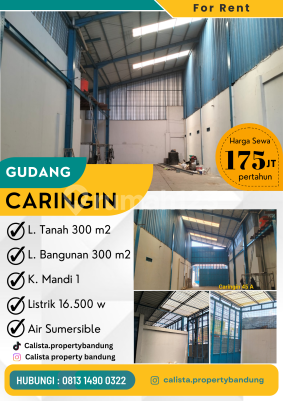 Gudang di Caringin. Spesifikasi Utama Properti: L. Tanah 300 m2 L. Bangunan 300 m2 K. Mandi 1 Listrik 16.500 w Air sumersible Harga sewa 175 Juta/Tahun Fitur unggulan: - Siap Huni. - Bebas Banjir. Berlokasi di Caringin, gudang ini memberikan kemudahan akses ke berbagai fasilitas menarik. Dengan harga Rp. 175.000.xxx, anda bisa memiliki hunian eksklusif yang sudah siap huni dan bersertifikat SHM - Sertifikat Hak Milik. Manfaatkan kesempatan untuk menikmati investasi di kawasan Caringin yang nyaman ini! Kontak segera untuk informasi lebih lanjut!