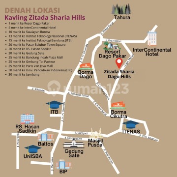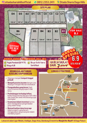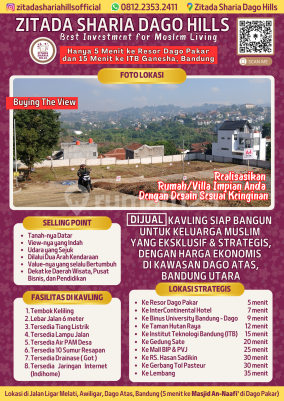 Jual Tanah Kavling Siap Bangun Blok B.1 (Luas 200 m2) di Cluster ZITADA SHARIA DAGO HILLS Kavling Keluarga Muslim Yang Eksklusif dan Strategis dengan Harga Ekonomis di Kawasan DAGO ATAS, Bandung Utara. Lokasi : hanya 5 menit ke Resor Dago Pakar dan 15 menit ke ITB Ganesa "Best Investment For Moslem Living", Realisasikan Rumah Impian Anda Dengan Desaint Sesuai Keinginan SELLING POINT 1. Sudah Sertifikat Hak Milik (Blok B.1) 2. Lokasi di tengah Pemukiman 3. Tanahnya Datar, Viewnya Indah dan Udaranya yang sejuk 4. Dilalui dua arah kendaraan 5. Lebar jalan masuk MENUJU Kavling : 8 meter 6. Lebar Jalan Masuk KE DALAM Kavling : 7 meter 7. Lebar Jalan DI DALAM Lingkungan Kavling : 6 meter 8. Fasilitas di dalam kavling yang lengkap, sehingga siap untuk membangun rumah 9. Value-nya yang selalu bertumbuh 10. Dekat ke Daerah Wisata, Pusat Bisnis dan Pendidikan 11. Ekslusif, terdapat hanya 14 unit FASILITAS 1. Cluster sudah di tembok keliling, dengan pondasi dan tembok yang kokoh 2. Lebar Jalan masuk ke dalam cluster 7 meter (sudah di cor beton) 3. Lebar Jalan lingkungan cluster 6 meter (sudah di cor beton) 4. Di depan kavling sudah ada drainase (saluran air kotor) 5. Di dalam cluster sudah ada 10 sumur resapan berukuran 1.5 m x 1.5 m, kedalaman 6 meter dengan tutup dan dindingnya kokoh (di cor beton) 6. Tersedia jaringan Internet (Indihome) 7. Tersedia akses untuk PAM Desa HARGA : Blok B.1 Luas Tanah 200 m2 (Lebar muka : 10 m) (Rp. 6.9 juta per m) Nego HARGA ALL IN : 1. Pajak Pembeli (BPHTB) 2. Biaya AJB 3. Biaya Balik Nama Sertifikat