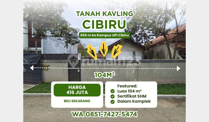 yang tertata, aman, dan nyaman. Tanah ini merupakan pilihan tepat bagi Anda yang menginginkan hunian pribadi dengan suasana tenang namun tetap memiliki aksesibilitas tinggi ke berbagai fasilitas utama di Bandung Timur. Cibiru merupakan salah satu wilayah dengan perkembangan infrastruktur tercepat di Bandung. Memiliki properti di area ini menjamin nilai kenaikan harga tanah (capital gain) yang signifikan setiap tahunnya, baik untuk digunakan sebagai tempat tinggal keluarga maupun aset investasi jangka panjang. Spesifikasi Lahan: - Luas Tanah: 104 m² - Kondisi: Lahan matang, kontur relatif rata, dan siap bangun - Akses: Jalan komplek memadai - Lingkungan: Kawasan sudah padat penduduk dengan suasana asri Keunggulan Lokasi: - Lokasi sangat dekat dengan Kampus UPI Cibiru, menjadikannya aset potensial untuk dijadikan rumah sewa atau kos-kosan. - Akses cepat menuju Masjid Raya Al Jabbar dan Stadion Gelora Bandung Lautan Api (GBLA). - Dekat dengan pusat perbelanjaan, minimarket, pusat kuliner, serta berbagai jenjang sekolah. - Kemudahan akses transportasi dan jalan utama yang menghubungkan area Bandung Timur dengan pusat kota maupun jalur keluar kota. dekat stasiun Cimekar dan Stasiun Kereta Cepat Woosh Segera Amankan unitnya hubungi nomor whatsapp tertera!