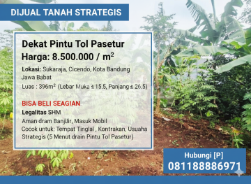 Dijual cepat lahan strategis siap bangun di Sukaraja, Cicendo, Kota Bandung. Lokasi premium hanya 5 menit dari pintu Tol Pasteur. - Luas: 396$m^2$(Lebar Muka ± 15,5m) - Legalitas: SHM (Clean & Clear) - Kondisi: Bebas banjir, akses mobil lancar - Fasilitas: Dekat pusat kota, pusat perbelanjaan, dan akses transportasi utama. Tanah serbaguna: Bisa untuk rumah tinggal, kantor, atau perumahan sewa. Menariknya, Anda BISA BELI SEBAGIAN . Harga: Rp 8.500.000 /$m^2$ Tertarik? Hubungi [PI] sekarang di nomor 0811xxxxxxxx untuk negosiasi dan survey.