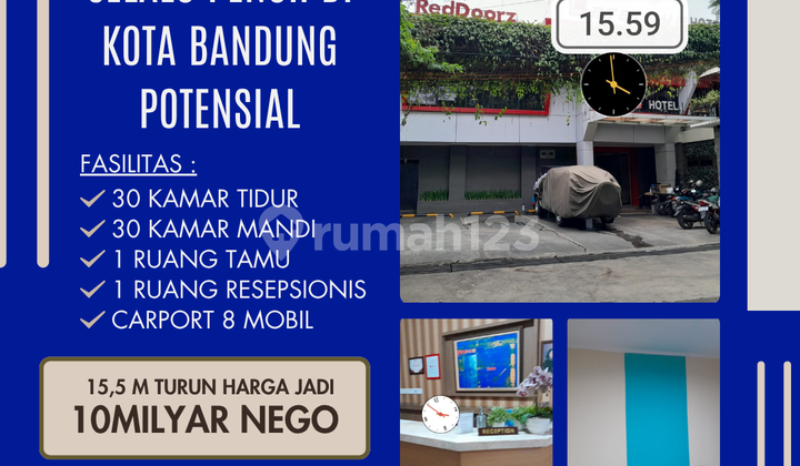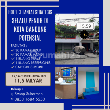 Hotel 3lantai strategis selalu penuh di kota bandung potensial strategis bebas banjir Harga: 15 Milyar TURUN HARGA JADI 12,5 MILYAR TURUN HARGA LAGI JADI 10 MILYAR Spesifikasi : Luas Tanah :456 Luas Bangunan: 600 Kamar Tidur : 30 Kamar Mandi : 30 Jumlah Lantai : 3 Sumber Air : Jetpam Bangunan tahun : Listrik : 20.000 Watt Orientasi : Utara Legalitas : SHM, IMB, PBB on Hand Carport 8 Mobil Akses jalan lebar 2 mobil Ada 2 Line Telpon yg Masih Aktif Full Furnish ; AC 30 Unit,TV tiap kamar, water heater tiap kamar, Kitchen Set, Lemari, tempat tidur/kasur SELLING POINT dekat kantor dinas pendidikan jawa barat dekat kampus negeri swasta dekat bio farma dekat mall pasirkaliki dekat perkantoran dekat rumah sakit negeri/swasta dekat berbagai mall dekat berbagai sekolah negeri/swasta dekat stasiun kereta api dekat berbagai hotel HARGA Jual: Rp. 15 M Nego TURUN HARGA JADI 12,5 MILYAR TURUN HARGA LAGI JADI 10 MILYAR Paminat serius hubungi: Nama : S. Asep Suherman Tlp/WA/ : 0853xxxxxxxx