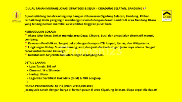 DIJUAL TANAH MURAH LOKASI STRATEGIS & SEJUK - CIGADUNG SELATAN, BANDUNG Dijual sebidang tanah kavling siap bangun di kawasan Cigadung Selatan, Bandung. Pilihan terbaik bagi Anda yang ingin membangun rumah dengan desain sendiri di area Bandung Utara yang tenang namun memiliki aksesibilitas tinggi ke pusat kota. KEUNGGULAN LOKASI: Akses Jalur Emas: Dekat menuju area Dago, Cikutra, Suci, dan akses jalur alternatif menuju Lembang. Kawasan Pendidikan: Sangat dekat dengan kampus ITB, Unpad, Itenas, dan Widyatama. Lingkungan Hidup: Suasana tenang, asri, dan jauh dari kebisingan jalan raya utama. Sangat cocok untuk hunian keluarga. Kualitas Air: Air jernih dan udara segar sepanjang hari. DETAIL LAHAN: Luas Tanah: 393 m² Dimensi: 14 x 28 meter Hadap: Utara Legalitas: Sertifikat Hak Milik (SHM) & PBB Lengkap HARGA PENAWARAN: Rp 7,5 jt/m² 294700xxxx Jarang ada tanah dengan harga di bawah pasar di area Cigadung Selatan. Siapa cepat dia dapat! Segera Hubungi Fajar Sidik - Pakar Mulia Property