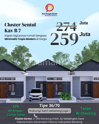 Siap launching ! Rumah minimalis on progress design tropis modern, dengan lokasi strategis dekat faskes, fasum, masjid, sekolahan dan pusat perbelanjaan. Terletak di Cluster Sentul, BSM Bandung Raya Residence. Cluster bebas banjir dan akses mobil, didukung udara sejuk dan view yang menawan. Akses mudah ke Cibiru, Cileunyi dan pusat kota Bandung. - Legalitas SHM sudah split - Terletak di kawasan padat penduduk dan berkembang - Dekat dengan perumahan Grand Cinunuk - Jalan lebar di cor, jalan muat 2 mobil - Sumber air melimpah - Tersedia kirmir dan selokan - Investasi yang menguntungkan - Hanya 3 menit ke SDN Cintagelar 4 dan masjid - Hanya 5 menit ke SMPN 3 Cileunyi dan Full Day School Al-Azhar Cairo - Hanya 7 menit ke jalan raya Cinunuk, Griya Cinunuk dan Borma Cinunuk - Hanya 7 menit ke SDN, Puskesmas Cinunuk dan kantor desa Cinunuk - Hanya 10 menit ke gerbang tol Cileunyi - Hanya 10 menit ke RS AMC - Hanya 12 menit ke Cibiru/UIN Sunan Gunung Jati - Hanya 14 menit ke pusat pendidikan Jatinangor (UNPAD, ITB, STPDN) - Hanya 14 menit ke pusat perbelanjaan Jatos - Legalitas Sertifikat Hak Milik (SHM) Pembayaran flexibel, bisa KPR ke Bank dengan DP minim, atau cicil langsung ke developer, tanpa BI checking. Proses cepat, anti ribet. Cicilan flat sampai lunas. Tunggu apa lagi, segera survei dan booking unitnya sekarang sebelum keduluan yang lain.