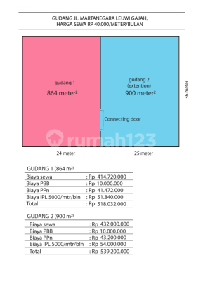Gudang rapi siap pakai akses kontainer 40 ft Leuwigajah Bandung >>>Henry Husen-0812*2225*2070-tanyahenryaja*com<<< Informasi Property : Gudang 1 - LB : 864 m2 - Biaya sewa : Rp. 414.720.xxx - Biaya PBB : Rp. 10.000.000 - Biaya PPn : Rp. 41.472.000 - Biaya IPL Rp. 5.000/m2/bln : Rp. 51.840.000 - TOTAL : Rp. 518.032.xxx / Thn Gudang 2 - LB : 900 m2 - Biaya Sewa : Rp. 432.000.xxx - Biaya PBB : Rp. 10.000.000 - Biaya PPn : Rp. 43.200.000 - Biaya IPL Rp. 5.000/m2/bln : Rp. 54.000.000 - TOTAL : Rp. 5392000xxxx-