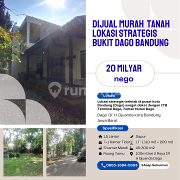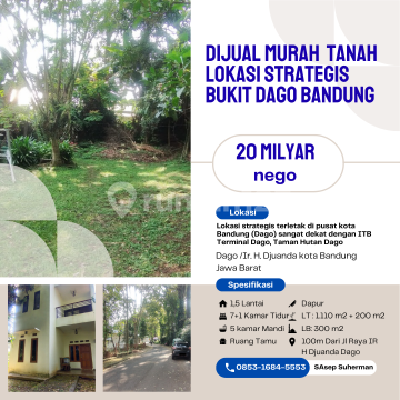 Dijual Murah Rumah Hitung Tanah Lokasi Strategis Nyaman Cocok untuk Rumah Tinggal Dll, Lokasi Rumah di Bukit Dago Kota Bandung, Hanya +- 100 Meteran Dari Jl Raya IR H Djuanda Dago Spesifikasi : Luas Tanah : 1.110 m2 luas Aktual + 200 m2 Luas Bangunan : 300 m2 Kamar Tidur : 8 + 1 Kamar Mandi : 5 Jumlah Lantai 1,5 Listrik 2.200 Watt + 1200 Watt Telp 1 Line Air Pam & Jetpump Garasi : 3 Carport : 3 Hadap : Selatan Legalitas : SHM Selling Point: Lokasi strategis terletak di pusat kota Bandung (Dago) sangat dekat dengan ITB Terminal Dago, Taman Hutan Dago Dekat ke : - Kampus ITB, Univ Harapan Bangsa, UNISBA,UNPAR,UNPAD,ITHB,LIKMI,UNIKOM - RS Borromeus, factory outlet, Cihampelas Walk,Travel Day Trans,Cipaganti,Cititrans - Bedah Plastik, Pusat Alat Bantu Dengar, Melawai Dago - SPBU Pertamina Dago - Bank Commonwealth, Bank Mega, BCA Dago dll - GraPari Telkom Dago - Forest Walk Babakan Siliwangi - Simpang Dago - Kebun Binatang Bandung - Apotek Kimia Farma - Dago Heritage - Cafe & Kuliner Harga : Rp 20 Milyard - Nego Paminat serius hubungi: S. Asep Suherman Tlp/WA/telegram : 08531684xxxx