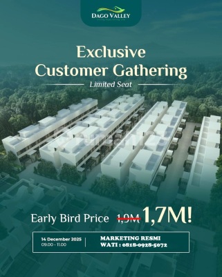 Rumah Dalam Cluster Elit Harga Promo Di Dago Valley Lingkungan Sejuk Asri Kota Bandung Tahap 2, Promo Opening khusus Cash Spesifikasi Rumah: Rumah 3 Lantai Lebar Muka 9 meter Luas Tanah 108 Luas Bangunan 100 3 Kamar Tidur 2 Kamar Mandi Ruang Tamu Ruang Keluarga Ruang Makan Dapur Teras Rooftop Taman depan dan belakang Carport 2 Mobil Fasilitas Lengkap: Gym Outdoor Mini Playground Jogging Track Info Lanjut Bisa langsung WA Untuk Info Rumah Lainnya cek di insta Propertyperumahanbandung Silahkan SAVE dan CEK dulu saja, Siapa Tau Kedepannya Perlu. Hubungi Marketing Exclusive : Wati Terima Kasih Note : Jadwal Survei Konfirmasi 1 Hari Sebelumnya