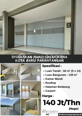 Ruko di Kota Baru Parahyangan. Cek segera ruko yang nyaman ini, disewakan menawarkan lingkungan fasilitas yang lengkap, cocok untuk Anda yang menginginkan hunian nyaman. Spesifikasi Utama Properti: - Kamar Mandi: 1 - Sertifikat: SHM - Sertifikat Hak Milik - Kondisi Perabotan: Unfurnished Dilengkapi dengan: - Jalur Telepon. Fitur unggulan: - Siap Huni. - Bebas Banjir. - Dekat Akses Bus Kota. - Dekat Akses MRT. - Dekat Sekolah Negeri. - Dekat Fasilitas Kesehatan. - Dekat Tempat Wisata. Berlokasi di Kota Baru Parahyangan, ruko ini memberikan kemudahan akses ke berbagai fasilitas menarik. Dengan harga Rp. 11.666.667, anda bisa memiliki hunian eksklusif yang sudah siap huni dan bersertifikat SHM - Sertifikat Hak Milik. Segera ambil kesempatan untuk menikmati pengalaman tinggal di kawasan Kota Baru Parahyangan yang nyaman ini! Hubungi segera untuk informasi lebih lanjut!