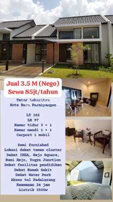 Dijual/disewa rumah Tatar Lokacitra, Kota Baru Parahyangan LT 162 LB 97 Kamar tidur 4 Kamar mandi 2 Listrik 3500 Air pam Carport Mobil SHM Lokasi dekat taman cluster Semi furnished: AC, gorden, kitchen set,Lemari Es, TV, sofa, meja TV, meja makan, kursi tamu) Harga jual 3.5 M nego Harga sewa 85 jt/tahun Tik-SAP