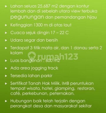 Luas tanah : 2,6Ha Luas bangunan : 500 m2 Legalitas : SHM Harga 650rb/m negotiable