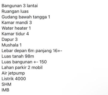 Dijual Ruko 3 Lantai di Sarijadi Bandung Lokasi Strategis & Siap Pakai! Spesifikasi Ruko: - Luas Tanah: 98 m² - Luas Bangunan: ±150 m² (3 lantai) - Lebar muka: ±6 meter | Panjang: ±16 meter - Kamar Tidur: 4 (bisa untuk kantor/staf) - Kamar Mandi: 3 (dilengkapi water heater) - Dapur: 3 area - Gudang bawah tangga - Mushala pribadi - Parkir: Muat 2 mobil - Air: Jetpump Harga 2,5 M Cocok untuk: - Kantor - Klinik - Tempat les/kursus - Toko retail - Tempat usaha dan tinggal (mixed-use) Keunggulan: - Bangunan 3 lantai siap pakai - Tata ruang fleksibel untuk berbagai jenis usaha - Lingkungan ramai & mudah dijangkau - Akses kendaraan lancar Segera hubungi untuk survei lokasi dan info harga! More details, Risma Meila LJH Realty Kota Baru Parahyangan Telp/Whatsapp 0821xxxxxxxx