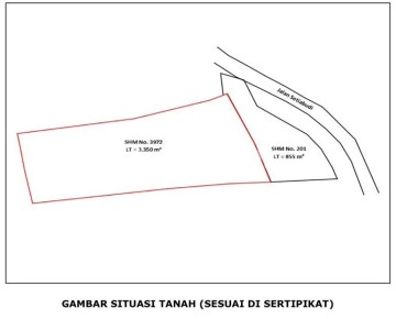 - Luas tanah 4205 m², - Lebar muka jln Setiabudi ± 40m, lebar muka jln Sukajadi ± 35m. - Bangunan rumah tinggal seluas 2786 m²,, - Greenhouse 470m², - Tanah kosong 952 m², dari jln Sukajadi