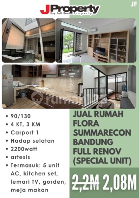 Jual Rumah Flora Summarecon Bdg Full Renov • 90/130 • 4 KT, 3 KM • Carport 1 • Hadap selatan • 2200watt • artesis • Termasuk: 5 unit AC, kitchen set, lemari TV, gorden, meja makan Harga Jual 2.2M —> 2.08M info : Judith JProperty - jf 0813xxxxxxxx