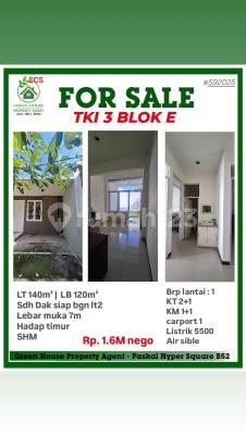 LISTING RUMAH TKI 3 blok E LT 140m² LB 120m² Sdh Dak siap bgn lt2 Lebar muka 7m Hadap timur SHM Brp lantai : 1 KT 2+1 KM 1+1 garasi - carport 1 Listrik 5500 Air sible Harga Rp. 1.6 nego #592025