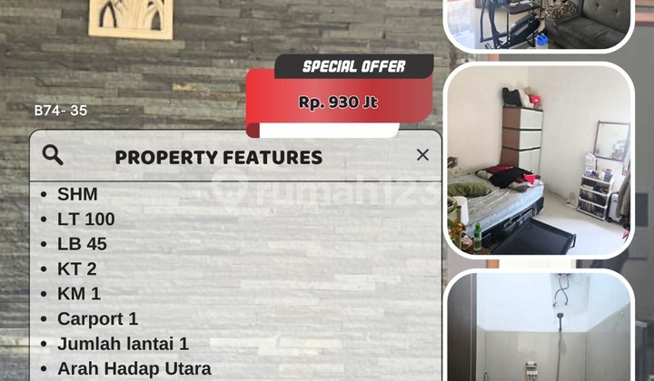 Dijual Harga : 930jt Jenis Sertifikat : Hak Milik Luas Tanah : 100 Luas Bangunan : 45 Jumlah Lantai : 1 Arah Hadap : Utara Umur Bangunan : 4th Listrik : 1300 watt Air : Sumur sibel 16m Kamar Tidur : 2 Kamar Mandi : 1 Carport : 1