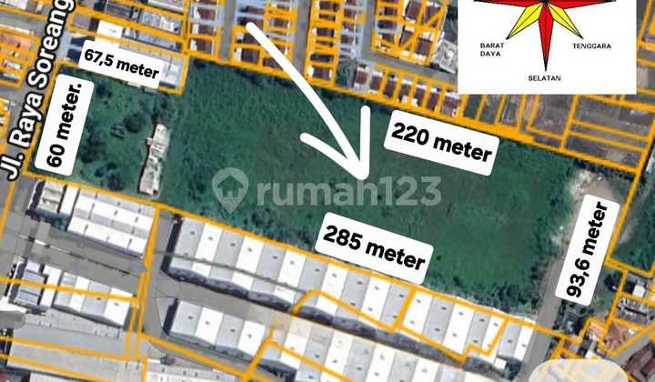 Di jual Tanah Mainroad Kopo Katapang Cocok utk per Gudangan Selling point 6 kilometer Tol Soreang Dekat Minimarket Pomp Bensin SHM Luas.24.642 m² Lebar muka 60 meter Type datar Hadap Barat laut Zona Gudang Sudah di pagar Harga Jual. 11 jt/m² - nego bgs