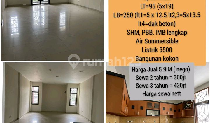 SHM,IMB lengkap,pbb lt/lb: 95/250 4 lantai, dak beton Bangunan kokoh summersible 5500w jual 5,9M nego sewa 2 thn= 300 jt 3 thn=420 jt harga sewa nett