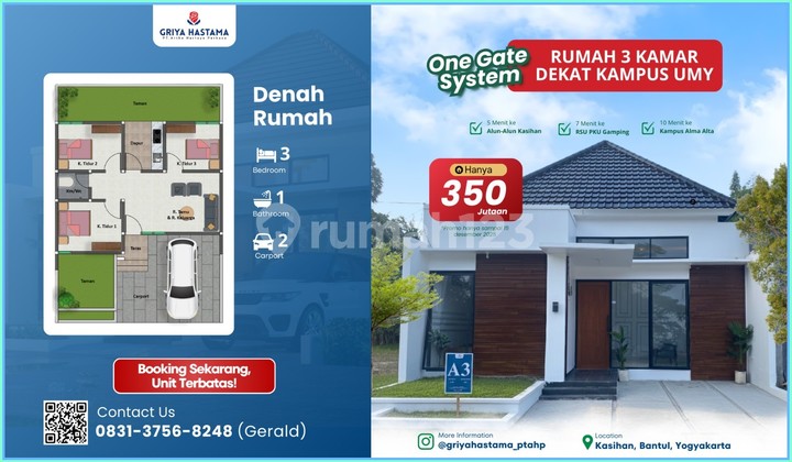 Jual Rumah Murah Jogja Cluster Dekat Kampus Umy 300 Jutaan Rasakan kenyamanan tinggal di rumah bergaya minimalis modern dengan desain elegan, fungsional, dan penuh cahaya alami. Berlokasi di cluster one gate system yang aman dan privat, hunian ini memberikan ketenangan sekaligus prestise bagi keluarga Anda. Tempat ideal untuk membangun cerita indah bersama keluarga. Spesifikasi : - Type Bangunan 40m2 - 70m2 - Luas Tanah 72m2 - 120 m2 - Kamar Tidur : 2 - Kamar Mandi : 1 - Ruang Tamu - Ruang Keluarga - Ruang Makan - Dapur - Ruang Jemuran - Teras - Taman depan - Carport: 1 mobil - Sumber air: PDAM - Listrik 1300 watt Keunggulan : - Post Security - Taman - Row Jalan 6m - One Gate Sistem Lokasi Strategis : - 3 Menit ke SMP Kasihan - 3 menit ke Alfamart & Indomaret - 6 menit ke SPBU - 10 Menit ke UMY Yogyakarta - 10 Menit ke Alma Atta - 20 Menit ke Jl Malioboro Jangan lewatkan! Hubungi sekarang sebelum kehabisan!