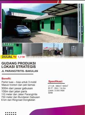 Gudang Bagus Dijual Jalan Parangtritis Timbulharjo Sewon Harga : 1,9 Milyar Spesifikasi :L * Luast tanah 580m2 * Luas Bangunan 500m2 * Ukuran Tanah 35mx14,3m * Listrik 5000Watt * SHM * Parkir luas bisa untuk 4 Mobil dan banyak motor * Tronton masuk * Air sumur pompa * Ruang Kantor * Cocok untuk Gudang Distribusi atau Gudang Produksi Akses : * 300 meter dari jalan Parangtritis * 750 meter dari Pasar Gabusan * 2Km dari kampus ISI * 3Km dari Ringroad Selatan * Strategis dan akses mudah Harga : 1,9 Milyar Contact Person Ismono Marwan Telpon / WA : 0812263xxxx IG : @propertyjogjatop ( JULI 2025 )