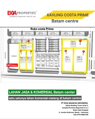*NEW COMMERCIAL BUSSINESS AREA* COSTA PRIME @Batam Center *Available 6 kavling komersial bisnis premium satu satunya di Batam centre *Spesifikasi :* - hadap jalan utama ada 4 kavling Masing² luas * 2673 m2 , 2674 m2, 5402 m2 dan 6639 m2 - hadap dalam kawasan ada 2 unit kavling masing² luas 1816 m2, dan 4522 m2 Cocok untuk bisnis perbankan, klinik kecantikan, gedung perkantoran, rumah sakit, perhotelan, showroom mobil mewah dan banyak lagi... Mana ada lagi kavling premium Batam centre luas di atas 1000xxxx m2? Hanya di sini ... - Daerah Kawasan Perumahan Elite Batam Center, seperti Citraland Megah, Beverly, Diamond Palace, Bonavista & Costarica. *Lokasi Strategis di Batam Center :* ±2 Menit menuju Grand Niaga Mas dan TOP 100 Batam Center ±2 Menit menuju Kawasan Pemerintahan Pusat Kota Batam ±3 Menit menuju Orchard Park dan Park Avenue Mall ±2 Menit menuju Mega Mall Batam Center ±2 Menit meuju Alun-Alun Engku Putri Batam *Informasi dan survey Hubungi EXIAproperties®