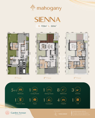 Cluster Mahogany merupakan cluster terbesar dan termewah di Garden Avenue Residence, hadir dengan konsep Naturally Luxurious yang memadukan kemewahan modern dan ketenangan alam tropis. Type SIENNA - The Grandest Home of Mahogany adalah rumah villa 3 lantai terbesar berukuran 7225xxxxx33) dengan panorama langsung Garden Avenue Park dan lake view di depan rumah. Dirancang untuk keluarga besar maupun ekspatriat, hunian ini menghadirkan ruang ekstra lega, desain fasad modern elegan, serta interior premium dengan lantai marmer, pencahayaan alami maksimal, dapur modern built-in, balkon hingga rooftop pribadi. Dengan tata ruang fungsional-lantai pertama untuk area sosial, lantai kedua untuk privasi keluarga, dan lantai ketiga untuk ruang serbaguna-SIENNA menawarkan kenyamanan villa tropis yang berpadu dengan gaya hidup prestisius. Lokasi strategis di koridor Bengkong-Batam Center juga memberikan akses cepat ke Garden Avenue Square, pusat komersial modern, sekolah internasional, mal, tempat wisata, serta Bengkong & Batam Center Ferry Terminal menuju Singapura dan Malaysia. Cluster Mahogany Type SIENNA adalah simbol hunian prestisius di Batam, menghadirkan kemewahan, kenyamanan, dan nuansa alam yang harmonis bagi mereka yang mendambakan gaya hidup Naturally Luxurious.