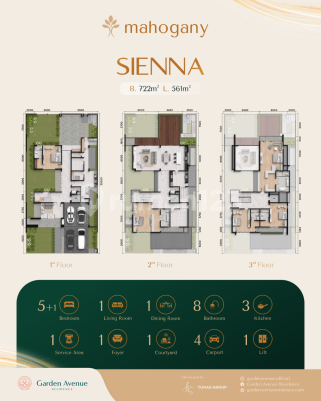 Rumah Villa Batam 3 Lantai dengan Lake View - Mahogany Type SIENNA Cluster Mahogany di Garden Avenue Residence menghadirkan konsep hunian Naturally Luxurious yang memadukan desain modern dan suasana tropis yang tenang. Type SIENNA adalah pilihan rumah villa Batam berukuran terbesar di cluster ini, dirancang untuk keluarga yang membutuhkan ruang lega dan kenyamanan jangka panjang. Type SIENNA - Luas bangunan/tanah 7225xxxxx33) - Rumah 3 lantai dengan panorama Garden Avenue Park & lake view - Fasad modern elegan dan interior premium - Lantai marmer, pencahayaan alami maksimal - Dapur built-in, balkon, dan rooftop pribadi Tata ruang disusun fungsional: lantai pertama untuk area bersama, lantai kedua untuk ruang privat keluarga, dan lantai ketiga untuk ruang fleksibel sesuai kebutuhan. Berlokasi di koridor Bypass Bengkong-Batam Center, dekat area komersial, sekolah internasional, pusat belanja, serta akses cepat ke ferry terminal menuju Singapura dan Malaysia. Mahogany Type SIENNA adalah pilihan tepat bagi Anda yang mencari rumah villa di Batam dengan ukuran luas, pemandangan terbuka, dan lingkungan premium dalam satu kawasan terintegrasi.