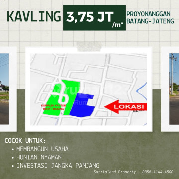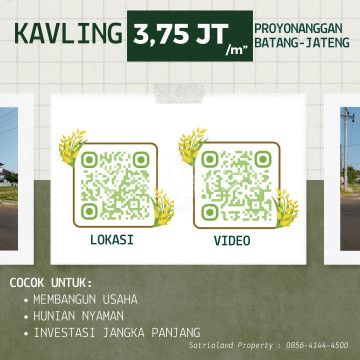 Dijual Tanah Kavling Pusat Kota Batang Jawa Tengah (Dekat KITB) Dekat Kawasan Industri Terpadu Batang (KITB) Potensi Pertumbuhan Ekonomi dan Bisnis Tinggi Prospek Investasi di masa depan ALAMAT : Proyonanggan SatriaLand Jln Brigjend Katamso Kota Batang - Jawa Tengah LOKASI STRATEGIS : - Pusat Kota (Samping Kompleks Kantor Bupati) - 600 m dari Alun2 Kota Batang - 20 Menit dari Kota Pekalongan - 25 Menit dari PLTU Batang - 25 Menit dari KITB Batang IDEAL UNTUK : - Kantor - Sekolah / Kampus - Tempat Usaha - Poliklinik - Apartemen - Hotel - Cafe / Resto INFO LAHAN : Luas Tanah : 4.350 m2 Status Tanah : Darat Status Kepemilikan : SHM Posisi Tanah : Hoek Lebar Jalan 7 Meter Punya 2 Sisi Muka Kontur Rata SCAN PETA LOKASI PADA QR CODE DI GAMBAR Pencarian Google Maps : Jl Bridgen Katamso Batang / Pertashop Kertonegaran Pencarian Video Lokasi (YouTube) : Jual Tanah Strategis di Pusat Kota Batang Potensial Untuk Pengembangan Property ITR Ready ! * SatriaLand Property * Informasi Lebih Lanjut Silahkan Hubungi : -[Nol Delapan Satu]-5667xxxxZaki) -[Nol Delapan Satu Enam]-1732xxxxBudi) -[Nol Delapan Sembilan ]-8993xxxxSari) #TanahDijual #TanahBatang #TanahKavling #TanahStrategis #PusatKotaBatang #DekatKITB #PropertiBatang #InvestasiTanah #InvestasiProperti #TanahKomersial #TanahSHM #SatriaLandProperty #KavlingBatang #LahanUsaha #TanahHoek #LahanInvestasi #TanahLuas #BatangJawaTengah #PropertiJawaTengah #KawasanIndustriBatang tanah dijual batang, tanah kavling pusat kota batang, tanah dekat kitb batang, tanah strategis batang, lahan investasi batang, properti batang jawa tengah, tanah hoek batang, tanah komersial batang, lahan usaha batang, tanah dekat kantor bupati batang, tanah siap bangun batang, investasi properti batang, tanah luas SHM batang, kavling strategis batang