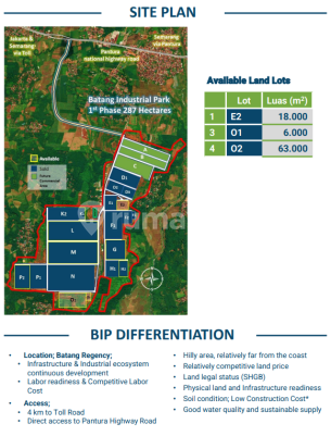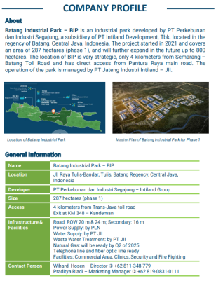 Strategic Industrial Land Batang Industrial Park 4 kilometers from Trans-Java toll road Exit at KM 348 – Kandeman Road: ROW 20 m & 24 m; Secondary: 16 m Power Supply: by PLN Water Supply: by PT JII Waste Water Treatment: by PT JII Natural Gas: will be ready by Q2 of 2025 Telephone line and fiber optic line ready Facilities: Commercial Area, Clinics, Security and Fire Fighting